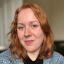 Eve with shoulder-length red hair smiling at the camera indoors, wearing a blue knitted cardigan over a black top.